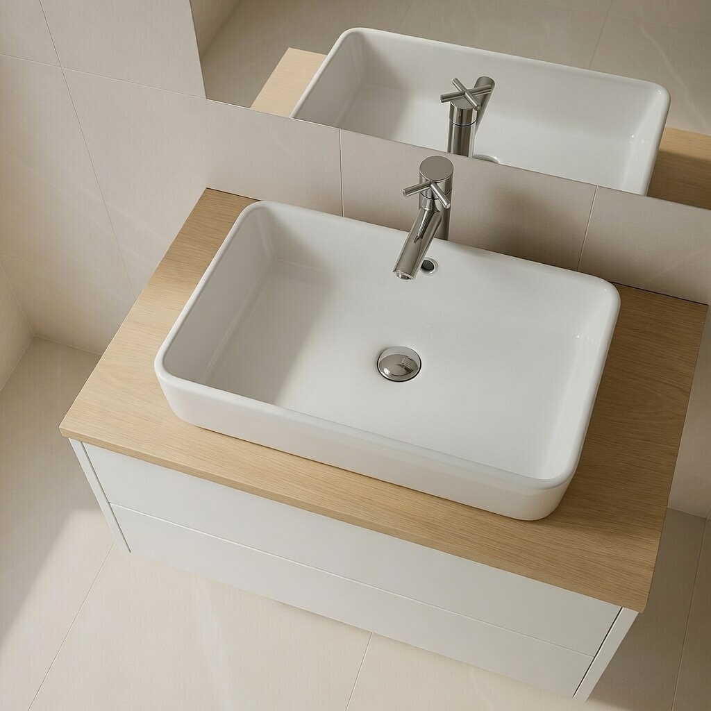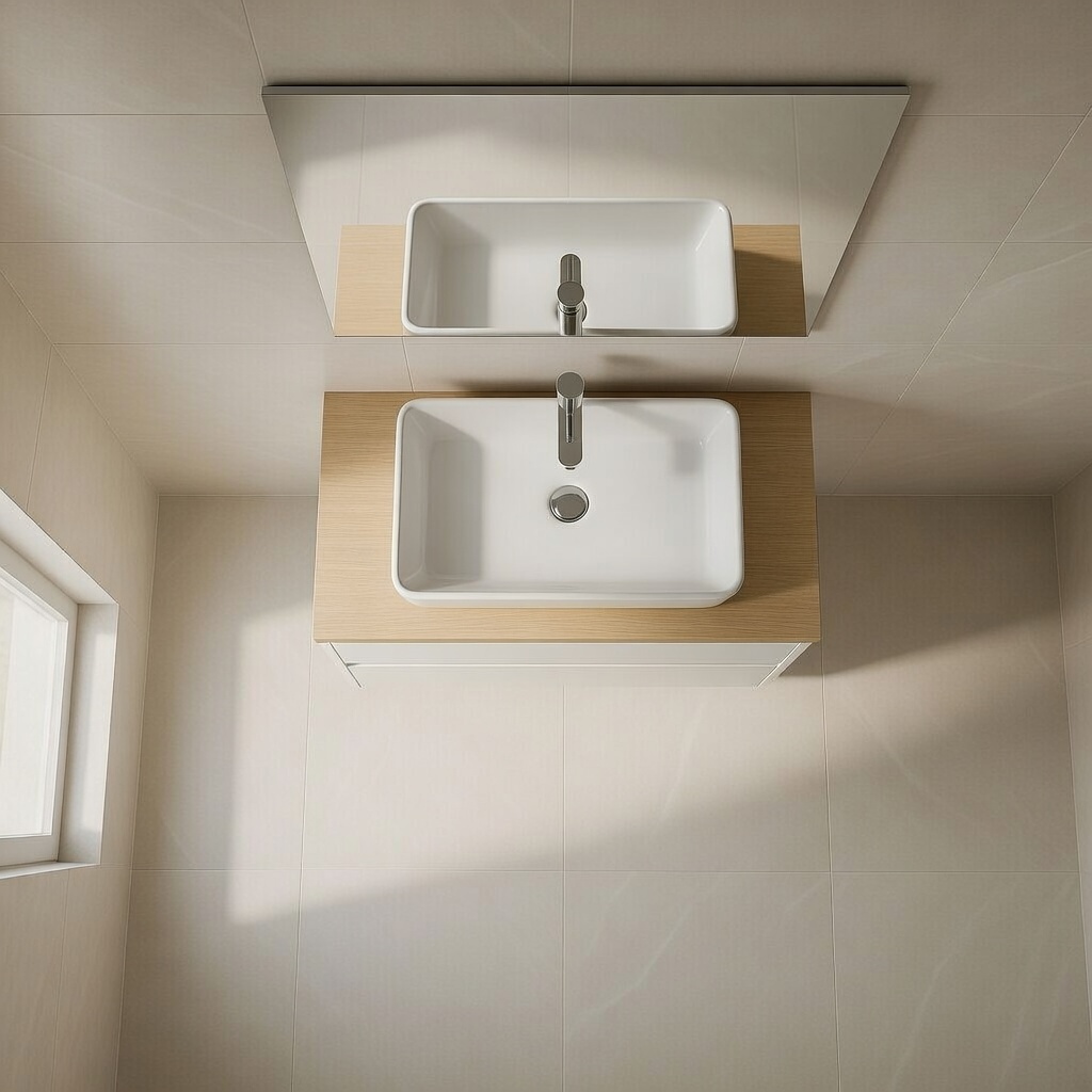 La struttura laccata opaca di colore bianco puro, che dona un aspetto morbido al tatto e una sensazione di estrema pulizia visiva. Il contrasto perfetto arriva dal top in legno naturale di rovere , con venature autentiche che portano calore e naturalezza allo spazio bagno, ammorbidendo le linee essenziali del mobile.