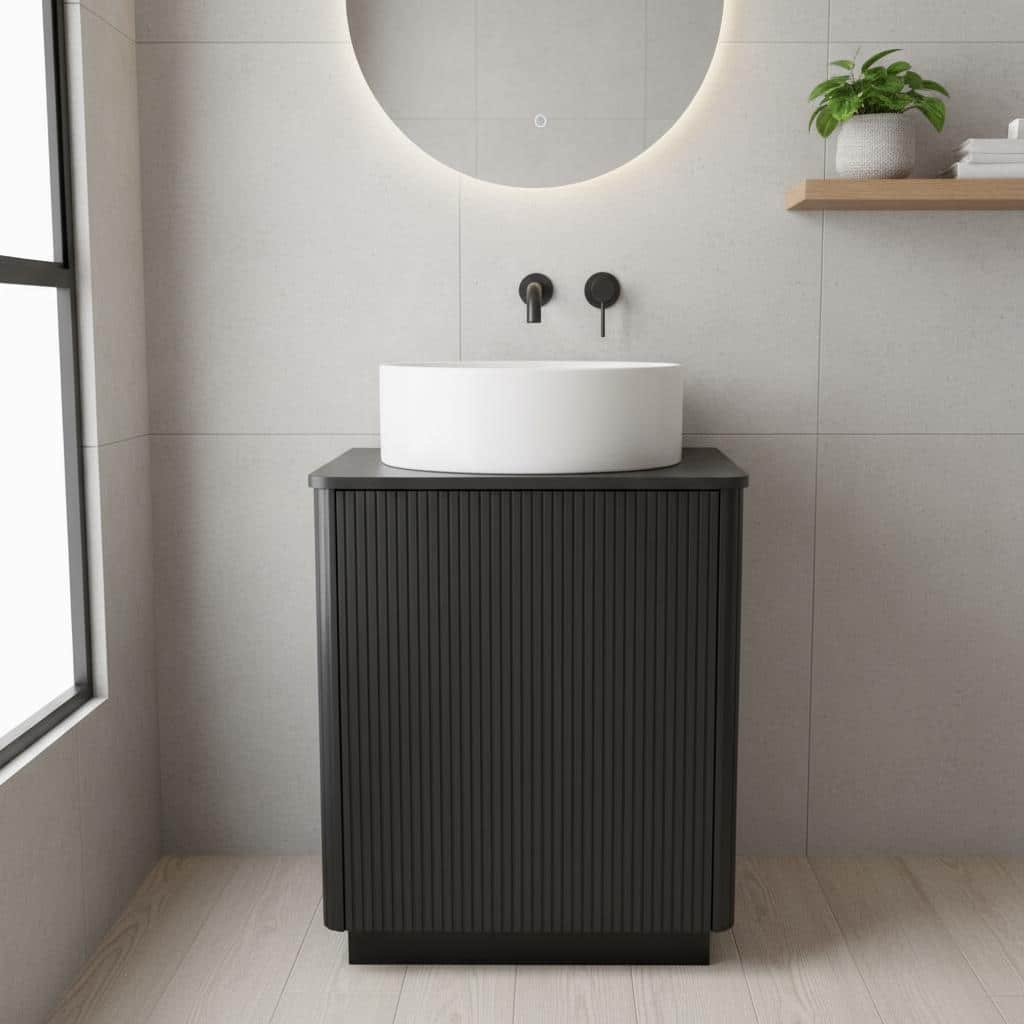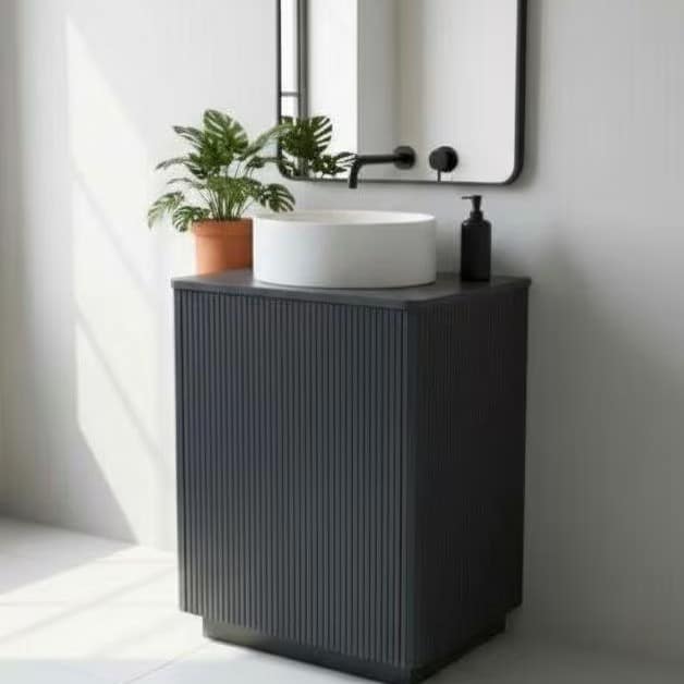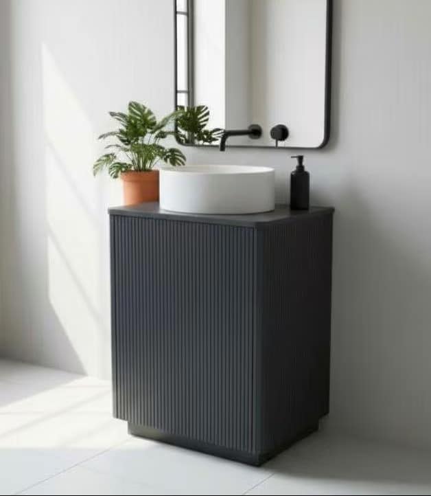 Mobile lavabo moderno in legno di frassino , finitura nero grafite opaco 0 gloss. Il design si distingue per le eleganti scanalature verticali (fluted panel) e angoli tondi che creano un gioco di luci e ombre sulla superficie, donando profondità e raffinatezza al mobile. La finitura nero grafite opaco a 0 gloss garantisce un effetto vellutato, estremamente elegante e anti-impronte.