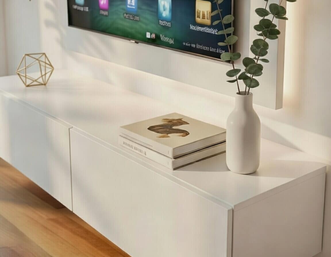 Scopri il Mobile TV Sospeso, la soluzione perfetta per un soggiorno moderno, elegante e funzionale. Finitura laccato bianco opaco di alta qualità, questo mobile combina design minimalista con massima praticità, donando luminosità e ordine alla parete.