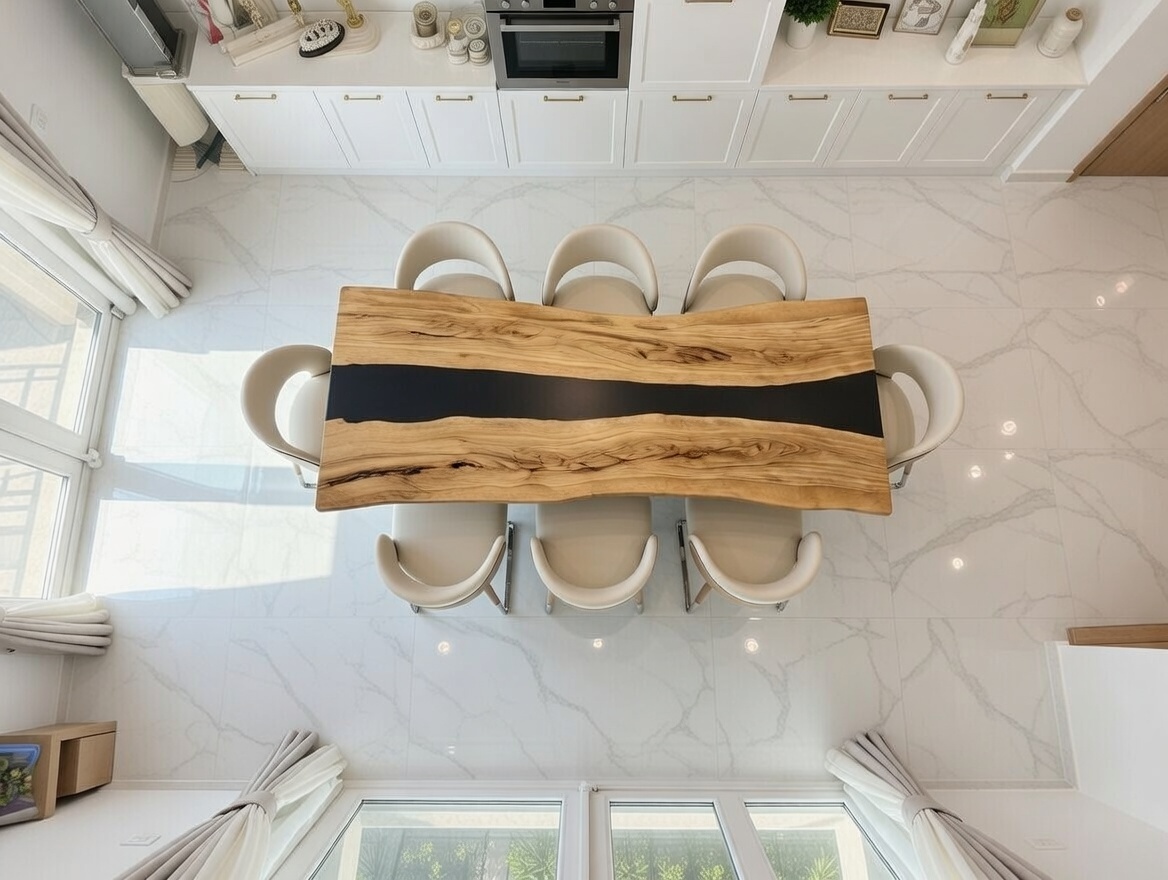 Il cuore del pezzo è segnato da un elegante fiume centrale in resina epossidica nera opaca (non lucida), che crea un contrasto grafico profondo e minimal: come un corso d’acqua antico che scorre tra terre fertili, donando modernità e carattere al piano.