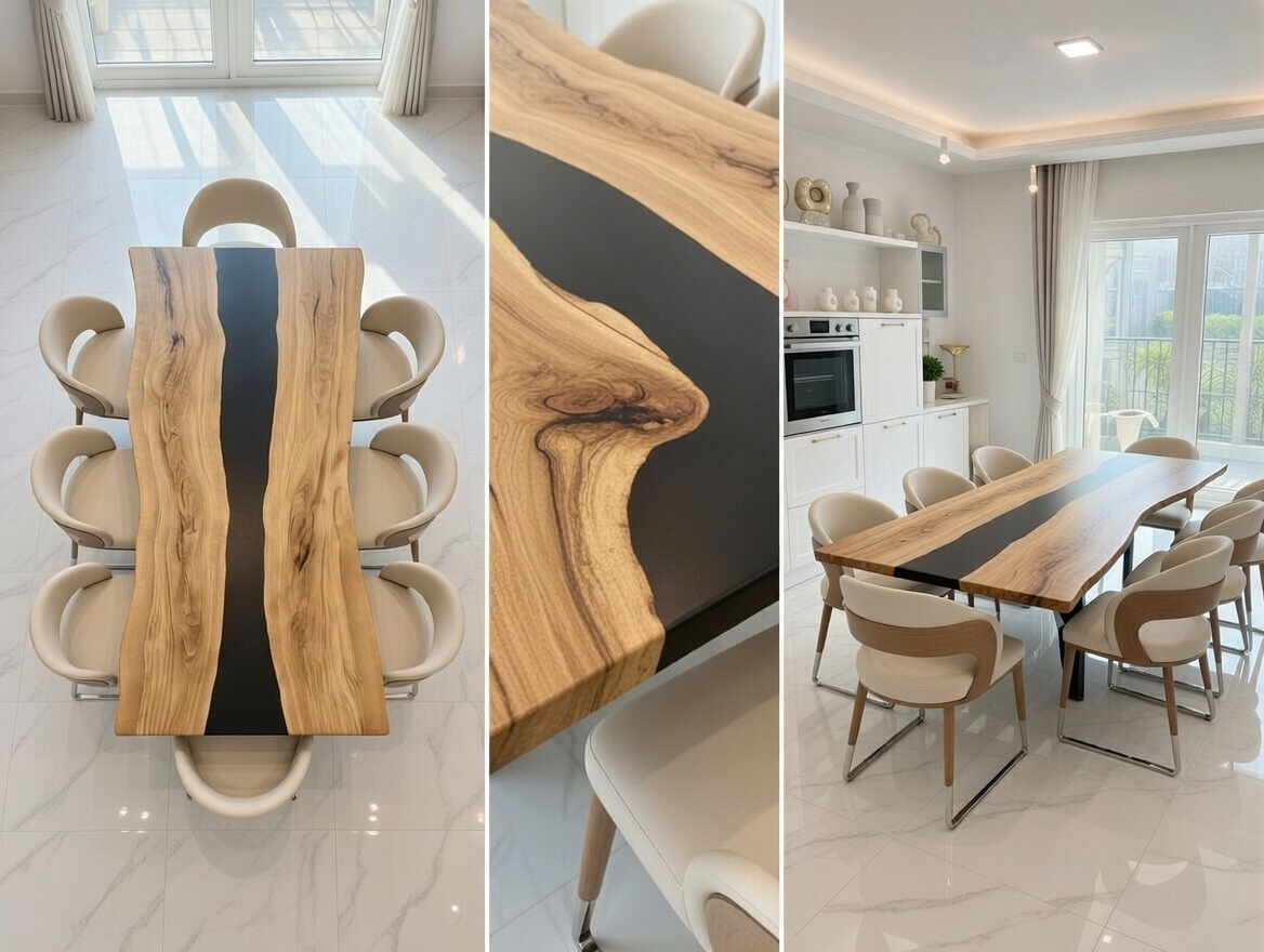 Tavolo unico in legno di ulivo massello con fiume centrale in resina nera opaca – pezzo artigianale esclusivo