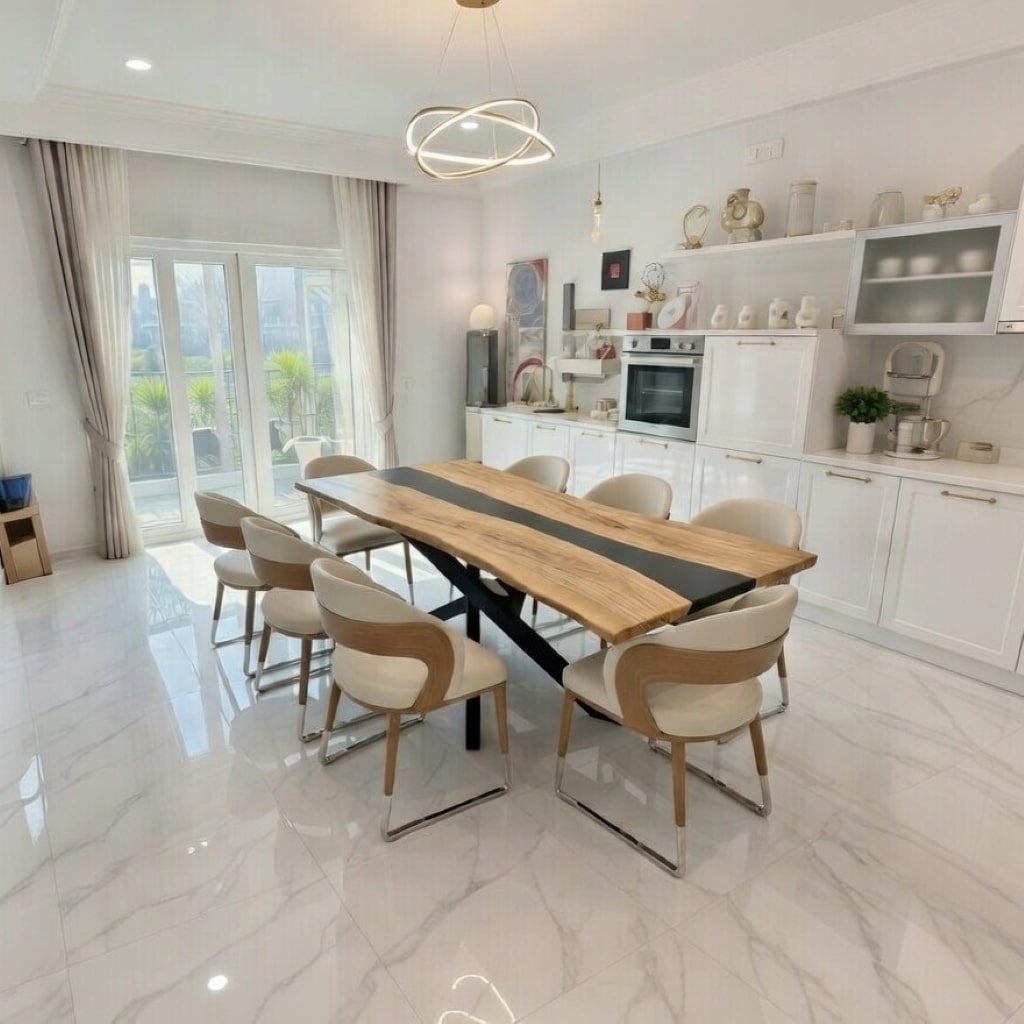 Perfetto abbinato a sedie organiche con struttura cromata/satinata e seduta in bouclé avorio-marrone chiaro, regala un’atmosfera lussuosa, accogliente e dal sapore mediterraneo-razionale – ideale per open space luminosi, ville di design, loft urbani o ambienti con forte personalità artigianale.